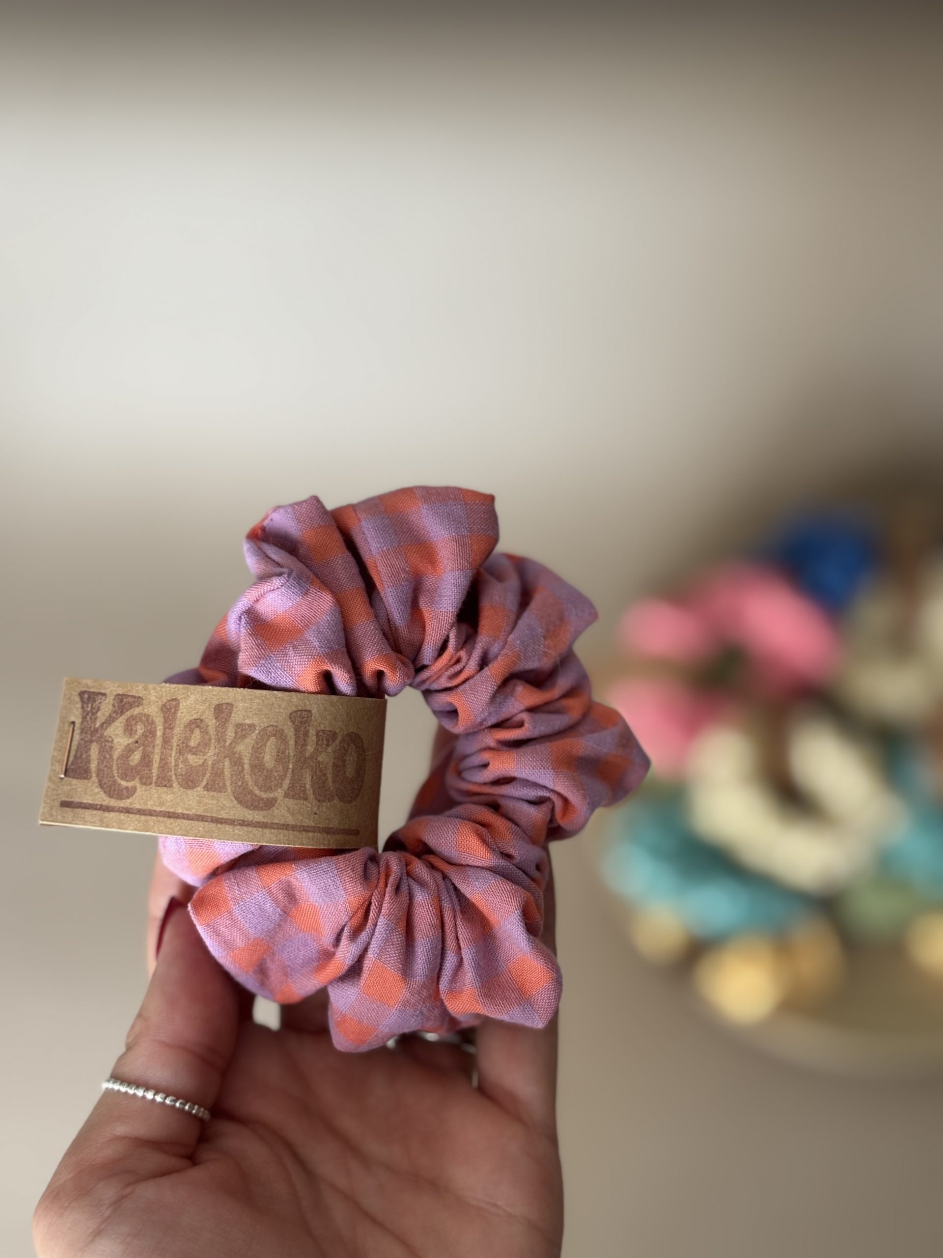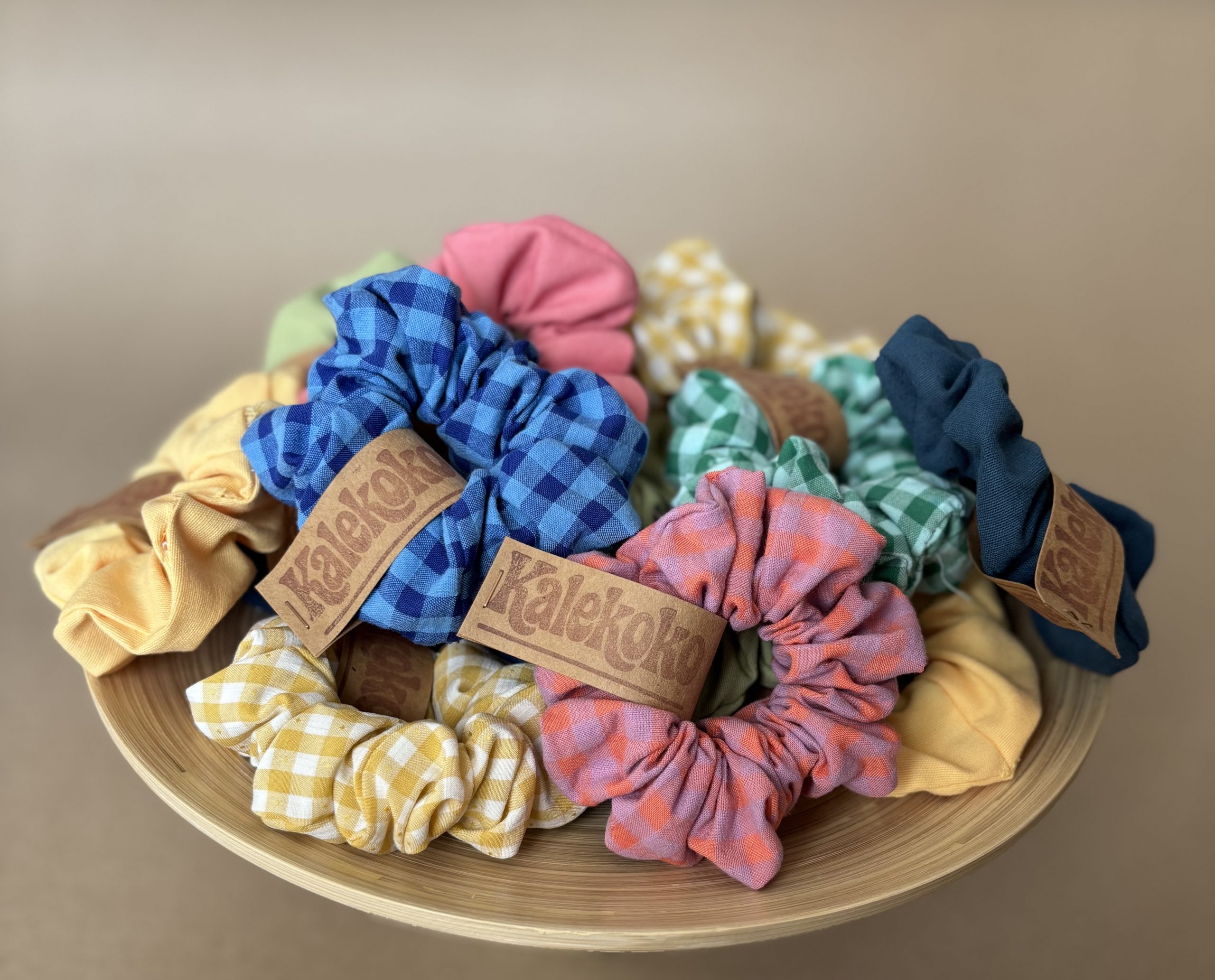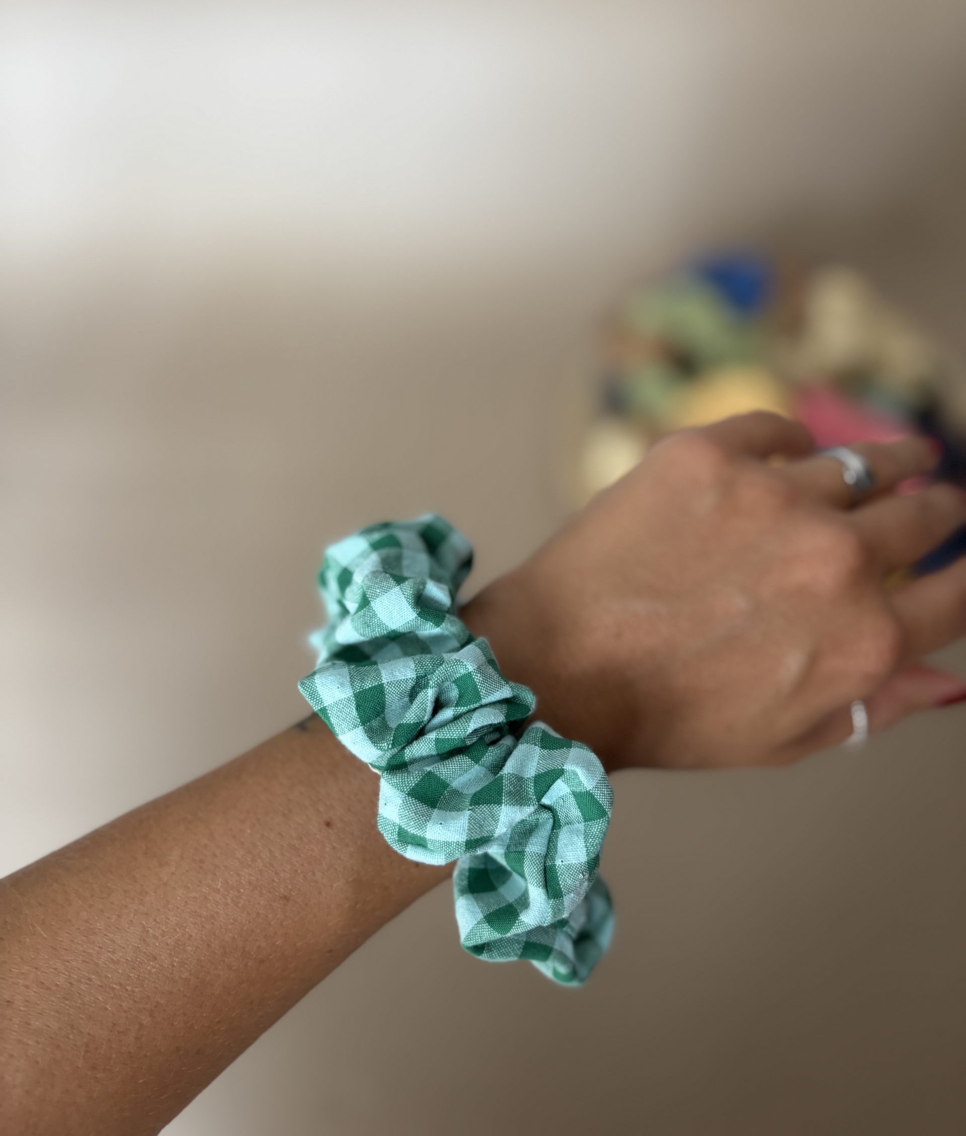 "Compré un scrunchie de cuadritos y es súper suave. El diseño es único y no daña mi pelo."