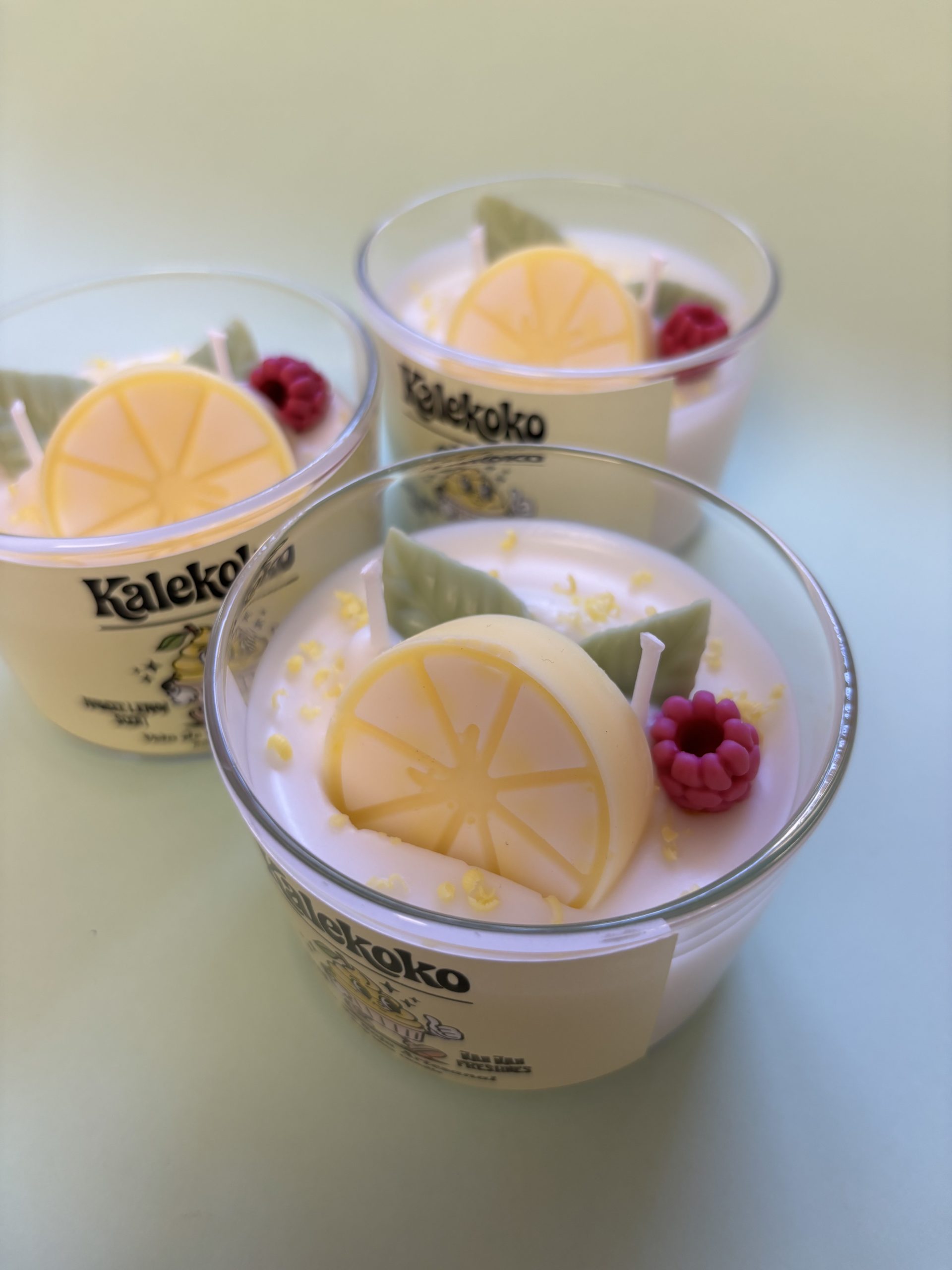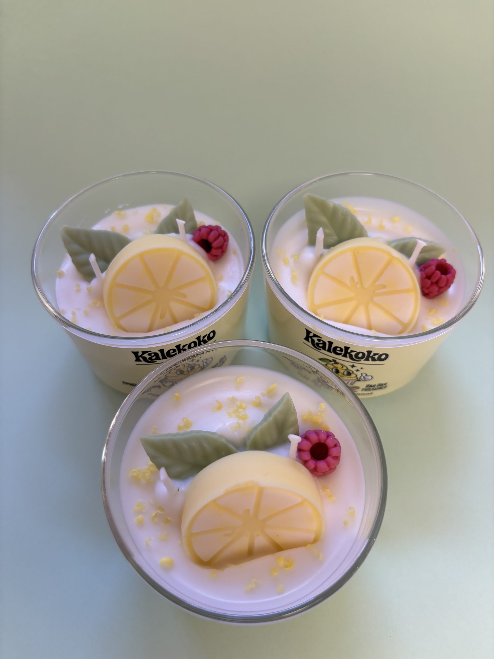 Elaborada artesanalmente con 180 g de cera de soja 100 % vegetal y ecológica, esta vela destaca por su diseño único que simula un mousse de limón real, decorado con un limón, una frambuesa y hojitas verdes hechas también de cera.